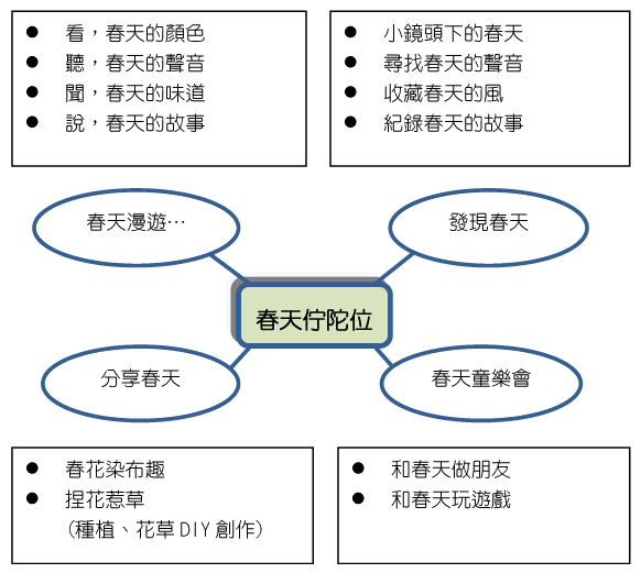 「春天佇陀位」將是我們陪著孩子一起在自然的校園環境裡漫遊,不斷藉著視覺、味覺、嗅覺、觸覺和聽覺「五感」去感受季節的變化,讓自己身體的感官交互作用,經驗美的事物,進而堆疊人我關係、探索事物,因著這些互動的經驗,引領孩子去拜訪春天,相信校園裡的每一角落,都可以成為我們和孩子的「春天遊樂園」。